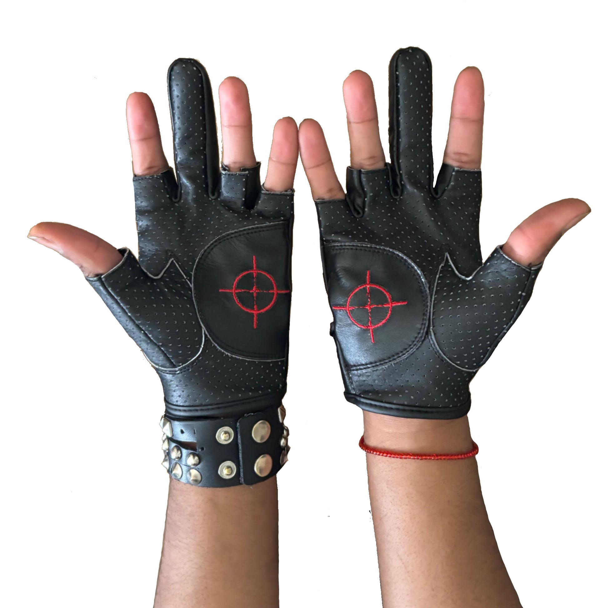 All-black leather gloves with different color variations on the strap and hand logos.